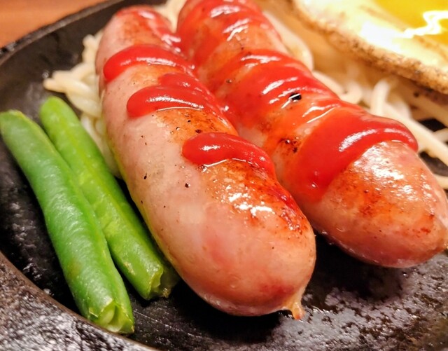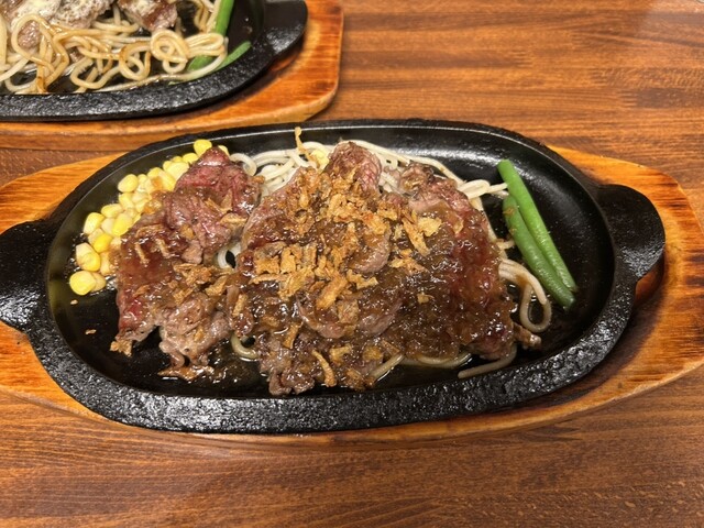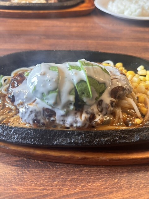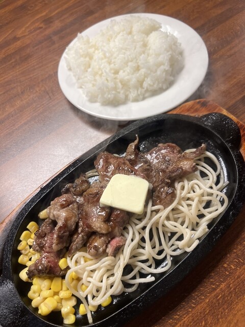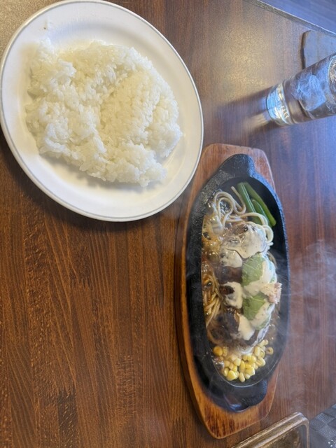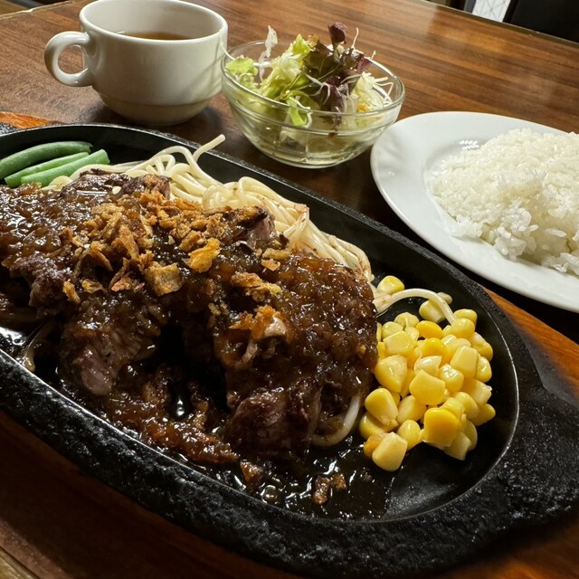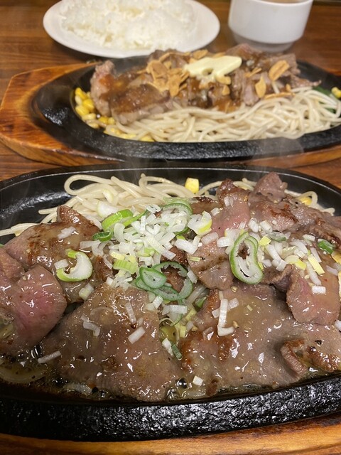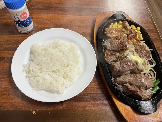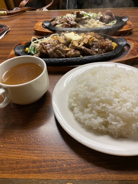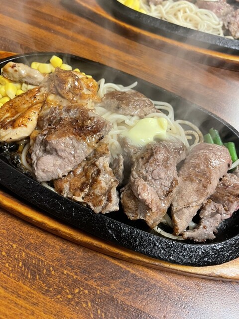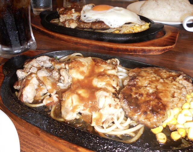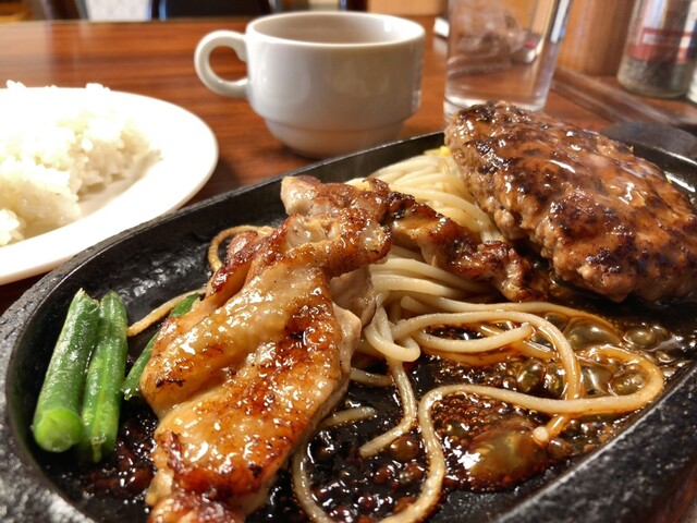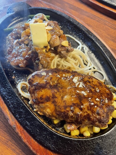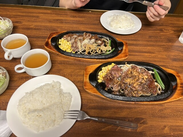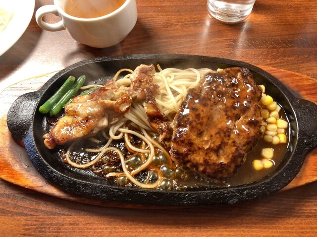 お肉食べたい人向きの鉄板に熱々のハンバーグとポークソテー?...