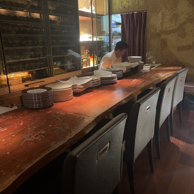 特別な一日にふさわしい店内には楢の一枚板のカウンター席に