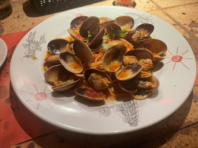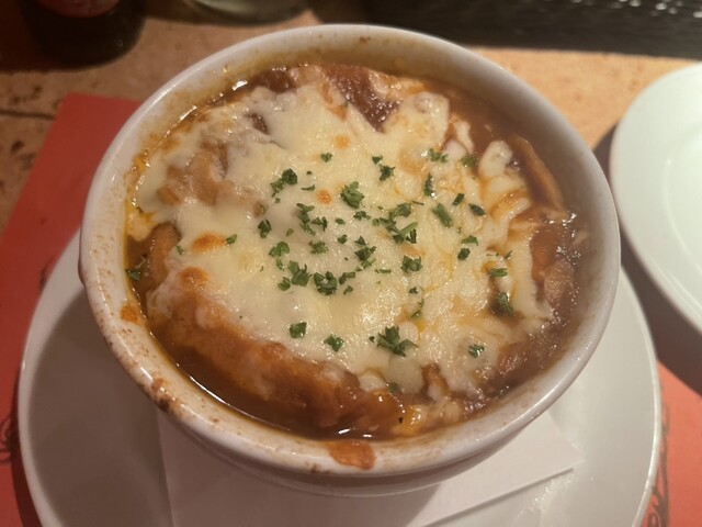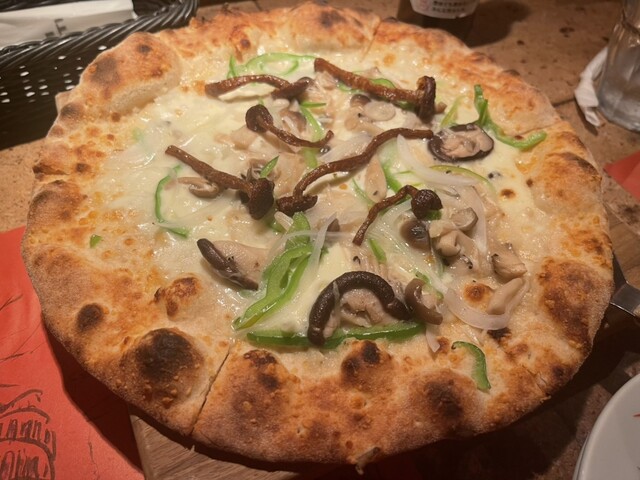 幸せサラダ、ソフトシェルクラブのピアディーナ巻き、オニオングラタンスープ、きのこのピッツァ、この日の生パスタはボンゴレロッソだったので私はそちらを。(連れは何らかのスパゲッティーにしてたけど写真なし)