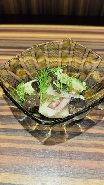 昨日は、夕食を食べに「酒坊主」へ。 美味しい日本酒と素敵な料理をいただきました。 こちら、おまかせ5品のみの注文になり、 足りない場合は、追加メニューから注文するルールになっています。 先ず、お豆のお通しの後に出てきたのが、 ・鮎の和え物 手ごした長野産の鮎をゼンマイ、みょうが... 詳細を見る