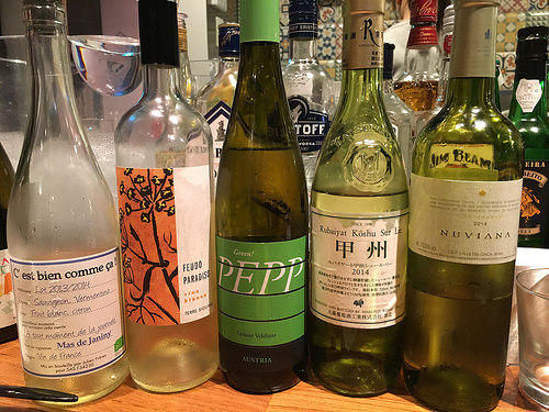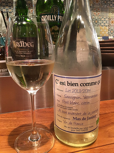 この日は白から。色々おすすめをきいて「C’estbiencommeca!Blanc」を60mlで。マス・ド・ジャニーニとディオニーの共同開発のワインで「C’estbiencommeca!=それええやん!」という意味らしい。ソーヴィニヨンブラン50%、ヴェルメンティーノ50%、ビオロジックなワインで透明感のあるみずみずしさと果実味がうまくまとまって飲みやすい。