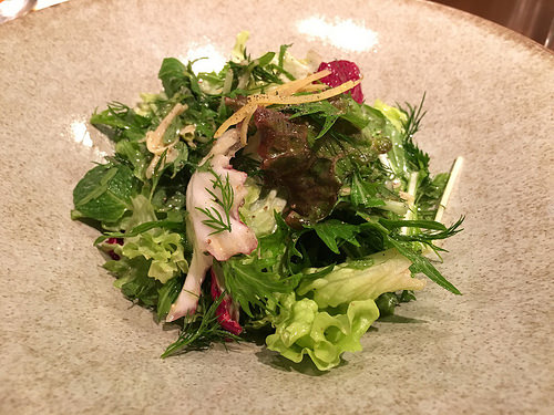 「ハーブサラダ」はレタスなどの葉ものに、ローズマリーのハーブが清々しく、柑橘系の皮(レモンかな)でさっぱりとしています。白にぴったりなサラダです。