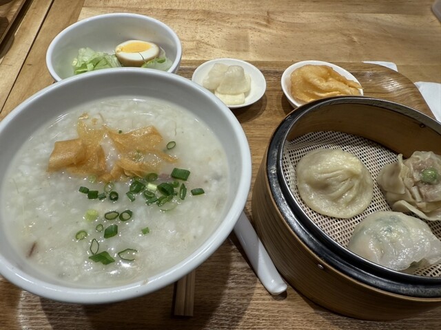 お粥、点心3つ、揚げ餃子?、サラダ、お漬物