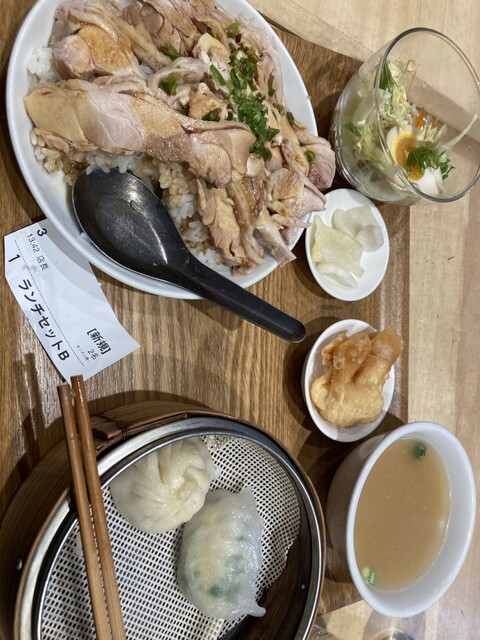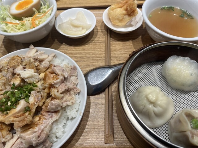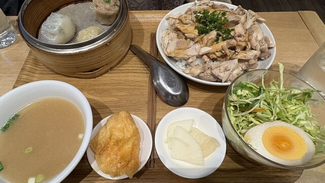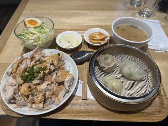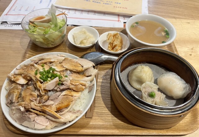 嶺南白鶏飯、点心3種、揚げワンタン、サラダ、お新香
