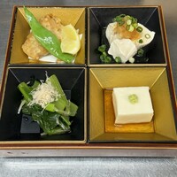 前菜4品、天ぷらの盛り合わせ、蕎麦のセットです。