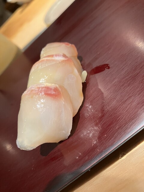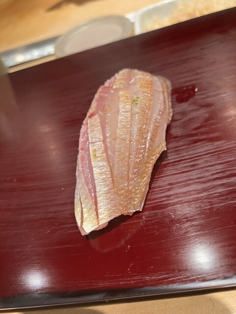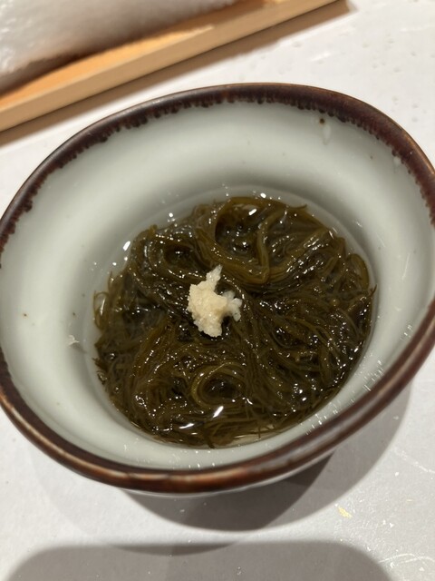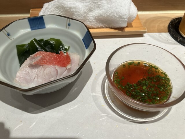 少しだけ湯通しした金目鯛を自家製ポン酢で頂くスタイル。少し火が入った金目鯛と自家製ポン酢のハーモニーが最高。付け合わせのワカメも新鮮で歯ごたえがあって美味しい。