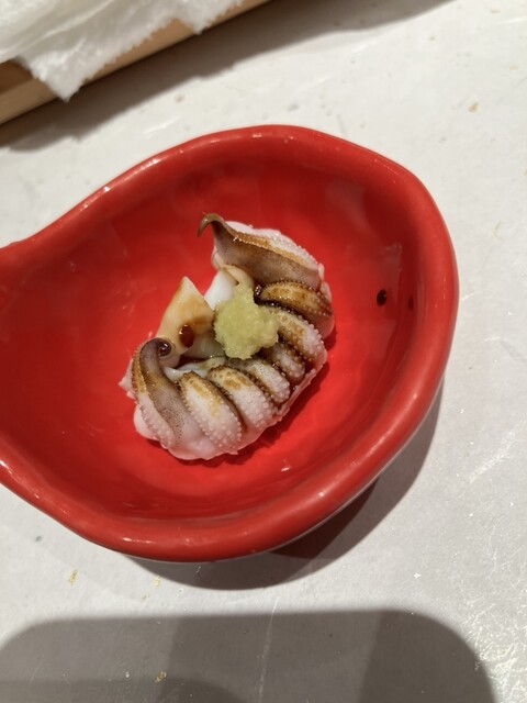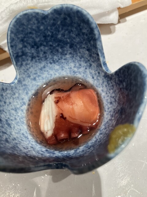 代々木上原駅至近の閑静な住宅街の中にあり、カウンター6席程度と4名の掘り炬燵席がある比較的小さなお店である。メニューはおまかせコースのみで、飲み物はビールの他日本酒や焼酎、ウイスキーがあり、大将がおすすめのものを出してくれる。おすすめコースの内容はお通しから果物まで何と全30品。にぎり、揚げ物、煮物、巻き物、シメにラーメンまであり、鮮やかな大将の手捌きをライブで鑑賞しつつ、オリジナリティ溢れた極上の逸品たちがまったく飽きがこないように次から次へと登場するさまはまさに劇場型スタイルで、見て良し、食べて良しの何とも楽しいお店である。全てが絶品だったのだが、30品全ての内容と感想は書ききれないので、写真に品名の説明を付け、中でも印象に残った逸品について感想を書き記したい。