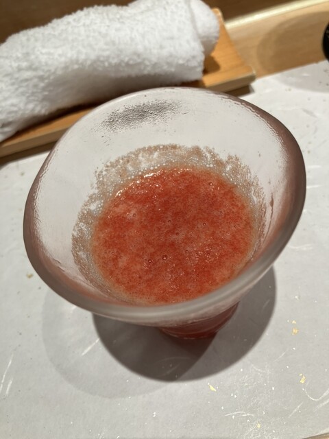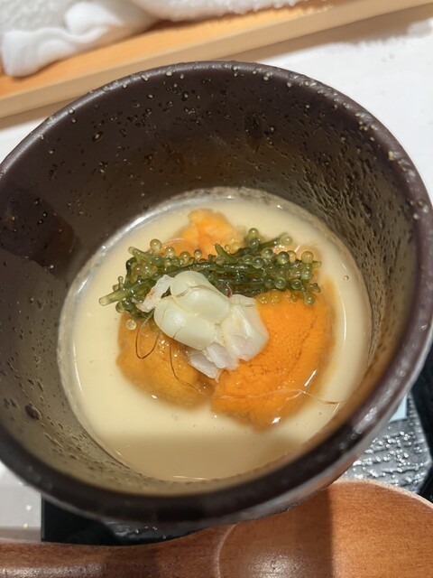 夏で暑いので冷製にした茶碗蒸し。ウニと卵の甘みと丁寧に取ったであろう出汁のハーモニーが極上の逸品