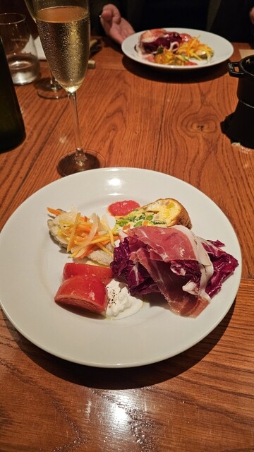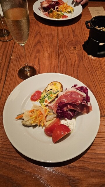 前菜盛り合わせはキッシュや生ハム、ワカサギのフリットなど内容が豊富で、ワインが欲しくなるラインナップ。
