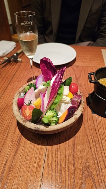 最初の季節野菜のバーニャカウダは、産地違いの野菜がたっぷりで、どれも瑞々しくシャキシャキ。特にさつまいもとキャベツの甘さが印象的でした。