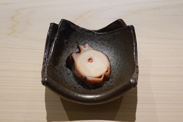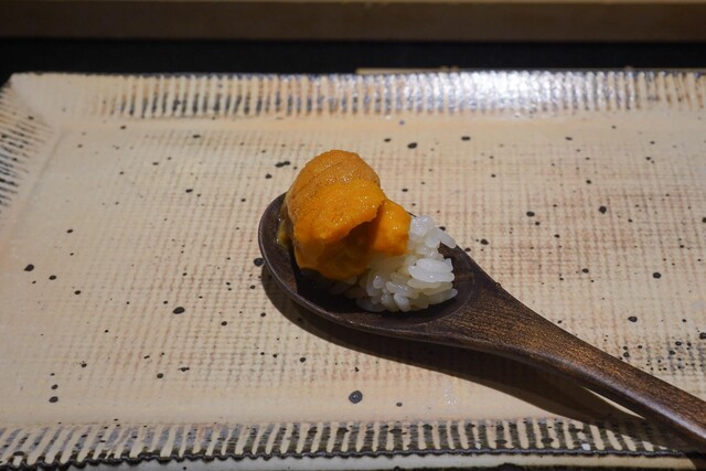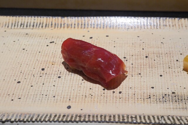 「鮨なんば」で修業の後、東北沢で店を構えた大将の西崎亮平氏。彼の最たるこだわりは「食感」にある。烏賊は透けて見える程に薄く削ぎ切りにし、何層ものミルフィーユ状に。春子は酢〆にすると身が硬くなると、硬い皮目のみにやさしく火を入れ、ふんわりとした身との調和を図る。求めるのはシャリとの一体感。食材が持つ些細なネガティブ要素を、徹底した仕事できれいに削ぎ落すことで、本来持つ魅力だけを大きく開花させる。