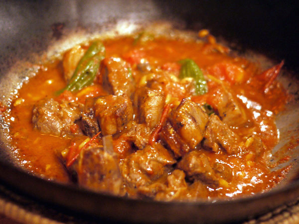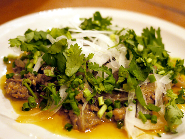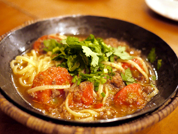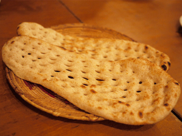 平日19:00事前に予約して訪問。一歩店内に足を踏み入れると、そこは土壁に囲まれ、オーナーがアフガニスタンやパキスタンで買い付けてきたという美しい絨毯桟敷が広がる(奥にはテーブル席あるが、大半は絨毯桟敷へ)。