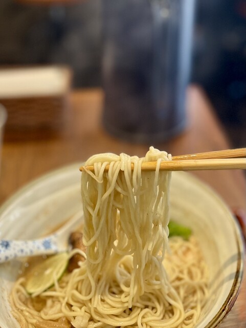 加水低・中細・ストレート。秋刀魚のスープによくあっていて、後半にかけてよりスープを纏って、箸が進む。