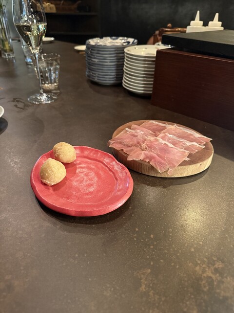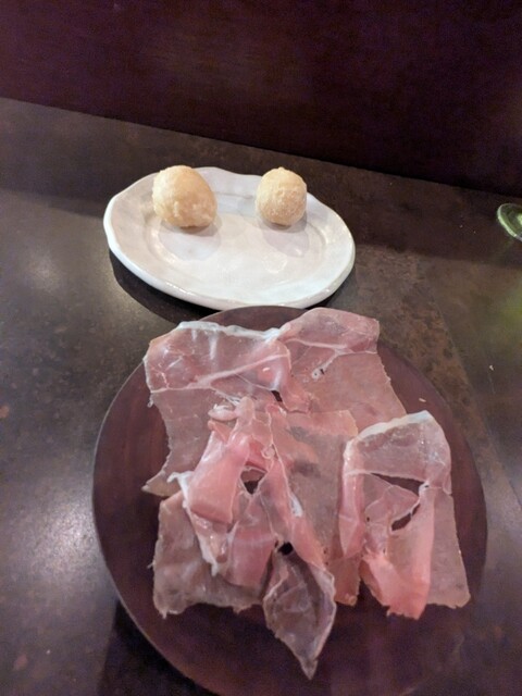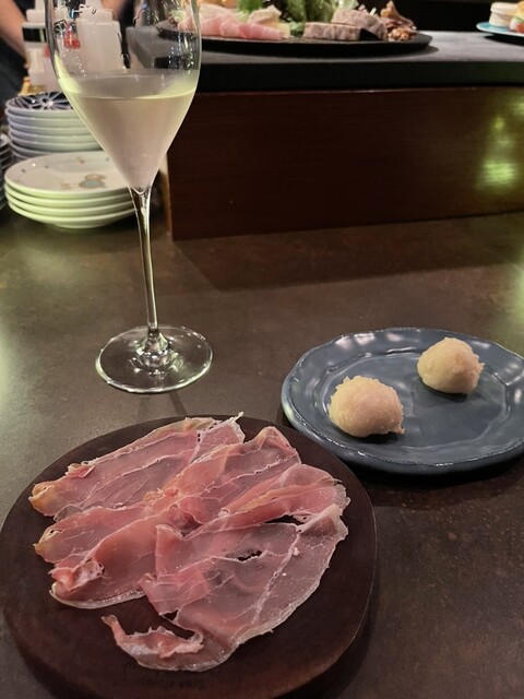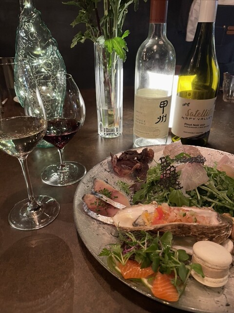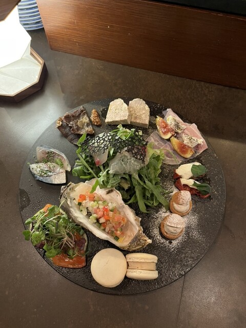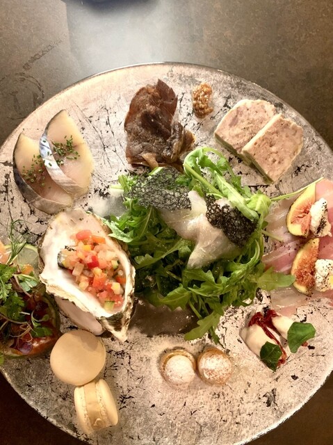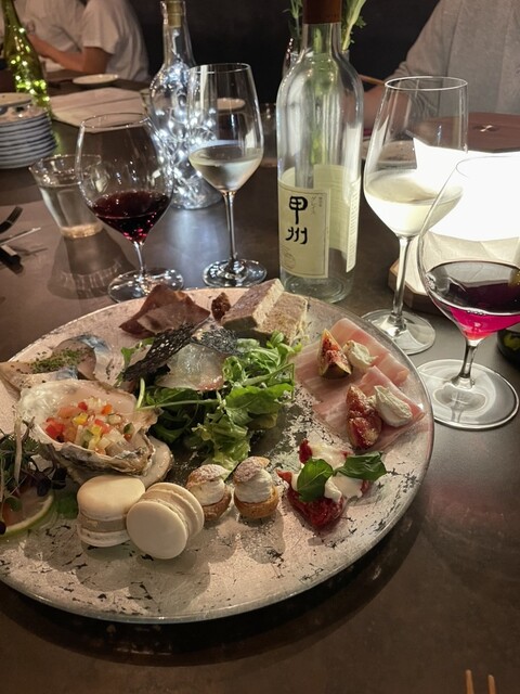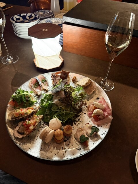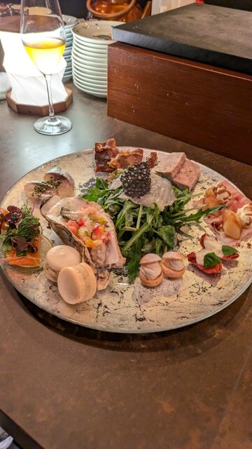 例によってインスタのリールに流れてきた良さげなお店で妻と記念日のお祝い。10,400円のプリフィクス+ワインペアリング5杯のコース。このお店はとにかく前菜10品盛り合わせ(この皿のペアのワインは赤白2...