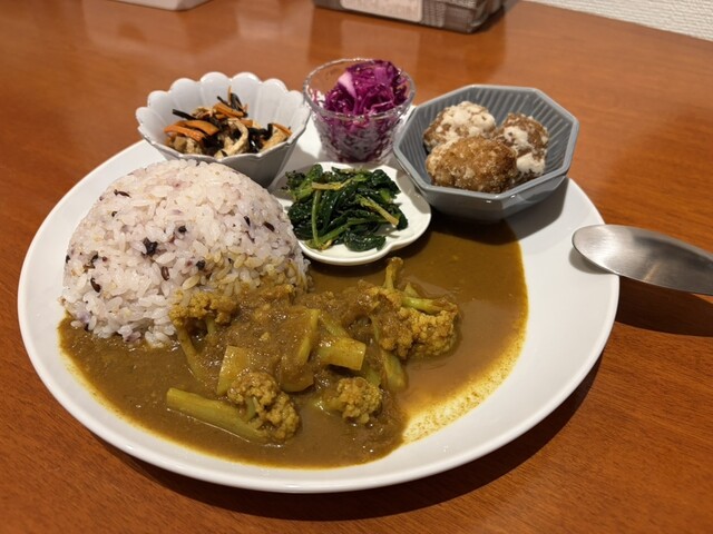 カレーセットと一汁八菜プレートをいただき、赤ワインをボトルで。コスパのよいワインでした✨ お食事は自然派野菜中心で、カレーはきちんとスパイスが効いていて、とーっても美味しかったで... 詳細を見る