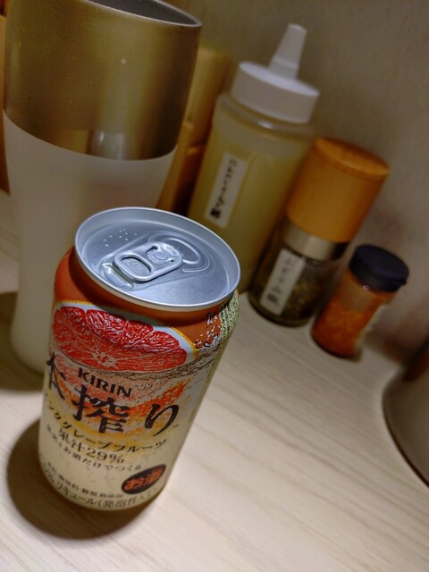 食券機を見ると、本日のラーメンということで丸鴨ラーメン(1200円)のみ販売中。肉丼(400円)を食べようかな…と思ったところ、この日はささみマヨ丼(200円)というのが販売されていたので、こちらを購入。「むかん系と言ったら酒だな」ということでグレープフルーツサワー(400円)も購入し、計1800円を電子マネーで支払いし、そのまま空席へと通されます。