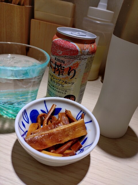 メニュー自体は特製牡蠣塩ラーメン(1000円)一択なので、食券機でそれを購入。「むかん系ならお酒が欲しいよね」ということでグレープフルーツサワーも(400円)購入。んー、ちょっとお腹も減ってるのよねぇ…ということで肉丼(400円)も購入し、店主さんに渡します。この日は店主さんのワンオペのようで、「お酒はセルフでお願いしますー」とのことだったんですが、冷蔵庫からタンブラーとお酒を持って席に戻ると「氷、入れますよ」と言いつつおつまみメンマを出してくれる気づかいが嬉しい。その後ぞろぞろと数名予約のお客さんがカウンターを埋め尽くしてました。