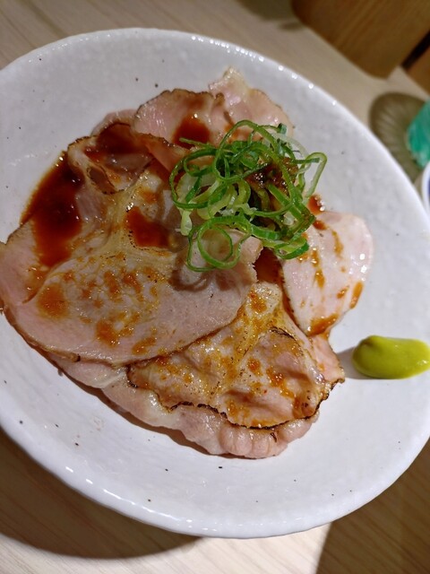 と、ここで肉丼が到着。薄切りされたローストポークをバーナーであぶってくれてるんですね。むかんさんの肉丼に近いんですが、あぶってくれてる分香ばしさが載ってる感じですね。タレもオリジナルとのことで、実に美味しそう。こちらもガブっといただくと…あー、美味しい。実に美味しい。タレの甘さと肉の香ばしさが実に良いですね。ラーメンのスープとの相性も良いので、こちらもぐいぐい箸が進みます。特に肉丼に添えられたワサビが良いですねぇ…。むかんさんではマヨネーズでこってり感と酸味の切れ味を出すタイプでしたけど、ワサビだと辛さと清涼感で切れが出てて、こちらも実に美味しい。麺をすすりつつ、スープを流し込みつつ、どんぶりをかきこみつつ、お酒を呑みつつ…なんてやってたら10分くらいで完食してしまい、退店となりました。