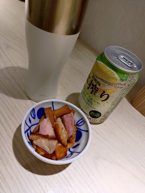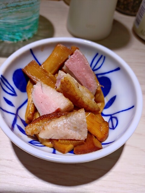 ふむー、まぁオープンしたてっていうのもあるんですが、店内が実にキレイで良いですね。予約制なだけにゆったりできるのも実に良い。すると店員さんがグレープフルーツサワーの缶と、氷の入った保温タンブラーを持ってきてくれたので、ぷしりと空けていただきます。あー、うめぇ…と思っていると、店主さんがおつまみを出してくれました。おお、メンマと鴨チャーシューですね。なんか結構ボリュームがあって、これだけで300円くらいは軽く取れそうなおつまみですよ。実に美味しそうで、さっそくいただきます。…うめぇ、鴨のアブラがヤバいですね。なんか鴨って変なところで食べるとただただ堅かったりするんですけど、ここのはしっとりとして、噛むたびにじゅわっとアブラのうま味が溶けだす感じ。いやー、美味い。これはラーメンの方も期待できそうですよ。