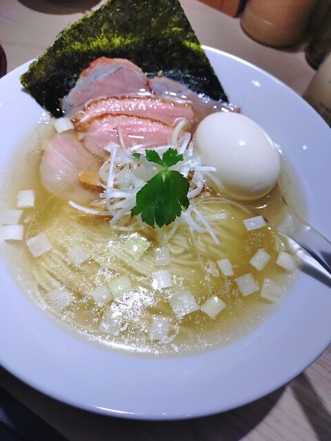 で、スープをひと口すすると…うぉ!! ちょーうめー!! 丸鶏の出汁とアブラが「これでもか!!」と溶け込んでて、体があったまる感じ。そこに結構しっかりめに塩だれが効いてて、うま味が爆発してますよ。ちょっと肌寒い気候になっていたので、心身ともにほっこりします。そして麺。牡蠣塩ラーメンの時は手もみ麺で不均一なふるふる中太麺だったんですが、今回のはちょっと細いストレート麺で、これがスープとの相性抜群。スープのうま味を適度に絡めつつツルリとしたのど越しが最高です。いやー、店主さん、若そうなのになかなか老獪なテクニックを身に着けてますねぇ…。そして鴨肉ですよ。しっとり柔らかくてうま味も残っており、「これだけ単品で注文できねぇかな?」と言いたくなるレベル。味玉もしっかり味が決まってて、半熟トロリの仕上がりで文句なし。これ以上はないんじゃないか、と思うくらい完成度の高いラーメンでした。