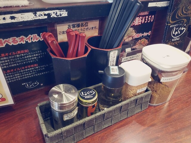 ランチタイムは麺大盛りとライス無料と太っ腹です。もちろん大盛りにしました。ライスは半ライスか小ライスか選べて咄嗟に半ライスと答えましたが、小ライスの方が多いのかな?仕上げ油はマー油か辛ネギ油選べて辛ネギ油にしました。