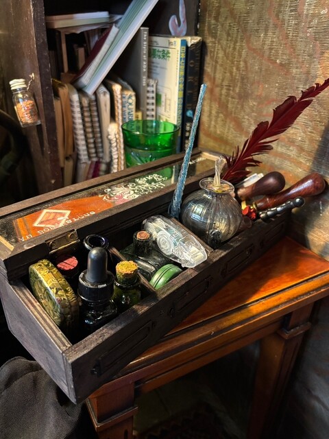 ペンはガラスペンや羽ペンもあるがけっこう書くのむずいのでボールペンがあると嬉しい。