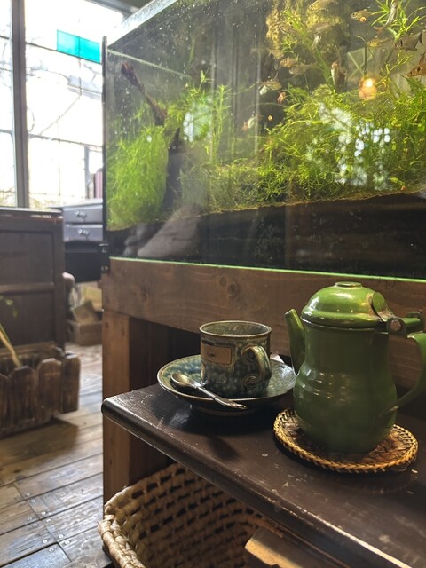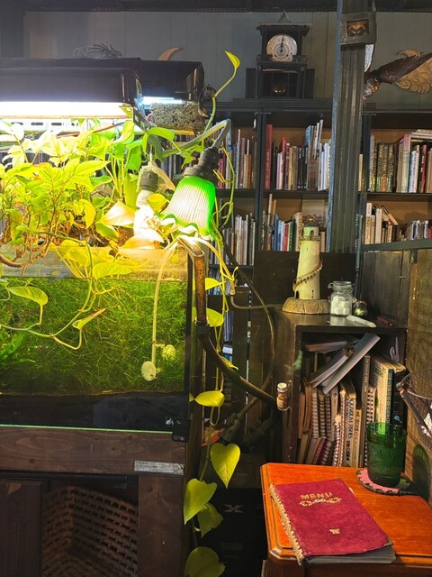 列車の中をイメージした店内は水槽に流れる水の音、床が軋む音のみが流れる、都会の中の異空間。