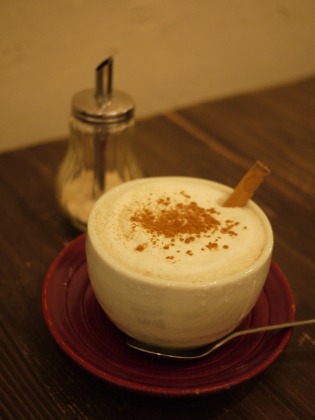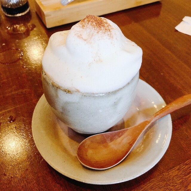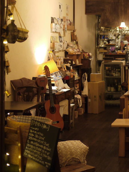 階段登ってすぐのアルミのやかん、店内のアンティーク調のランプやドライフラワー、ナチュラルな木の感じの作りが落ち着いた感じで、一人でも入りやすいです。
