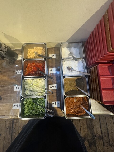店内には、セルフでパクチー、塩、唐辛子、山椒、唐辛子、激...