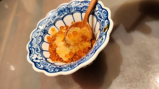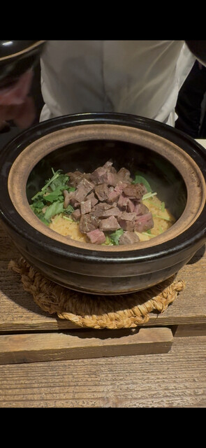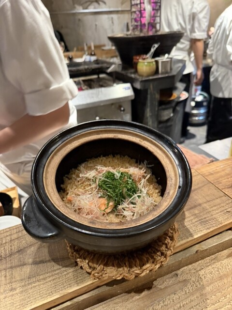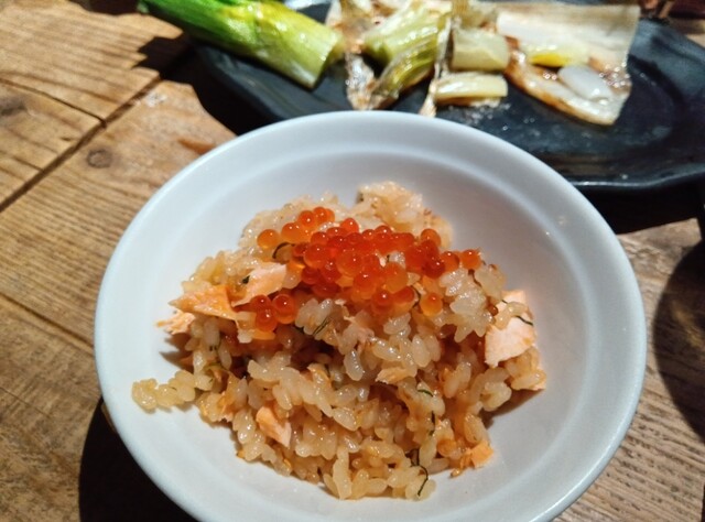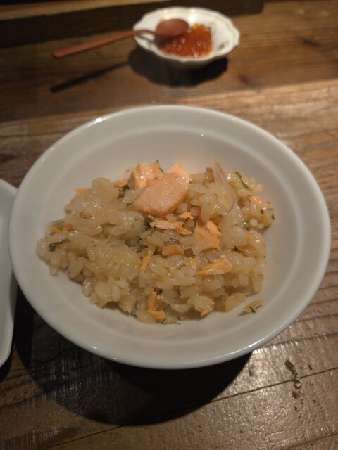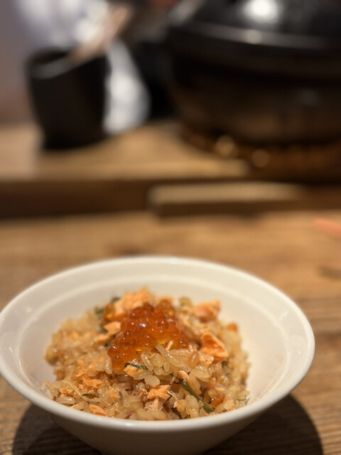 初めての訪問です。高円寺で飲んでいて、もう一軒とのことでこちらのお店に入店しました。シックな店構え、店内もお洒落な間接照明で女性客が多いです。メニューもお洒落なものが多い印象。最後に銀鮭とイクラの土鍋...
