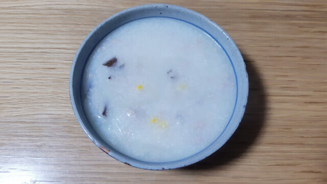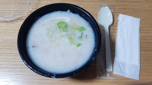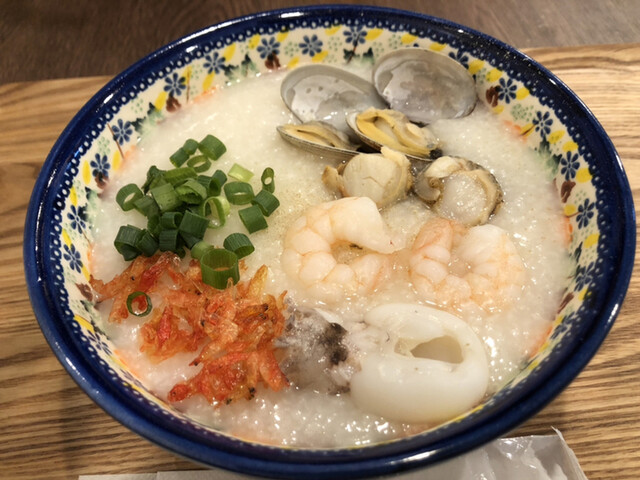 香港のお粥は鶏肉や干し貝柱で出汁を取った中華スープで長時間煮込んで作るとのこと、米は粒として形を留...