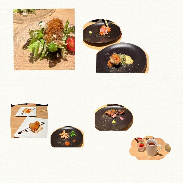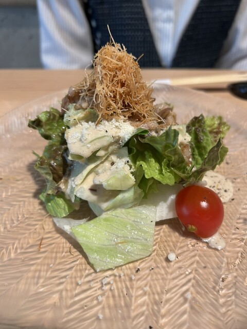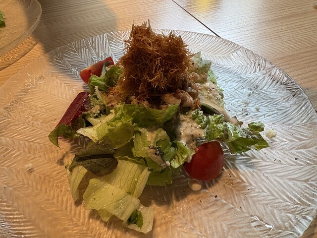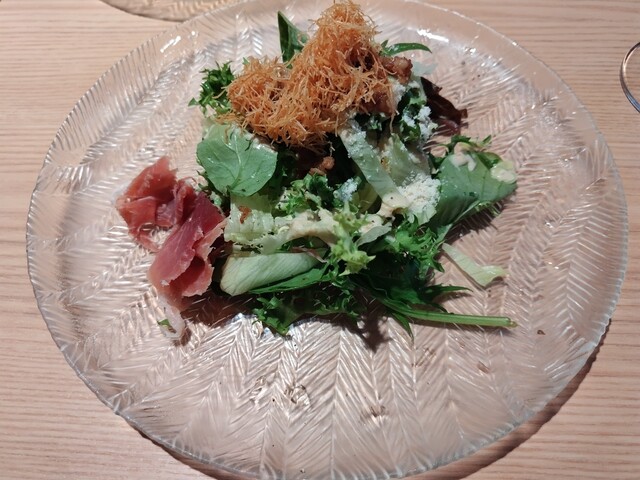まず前菜のパルメザンチーズと岩中豚のサラダからして、素材へのこだわりを感じます。濃厚なチーズと上...