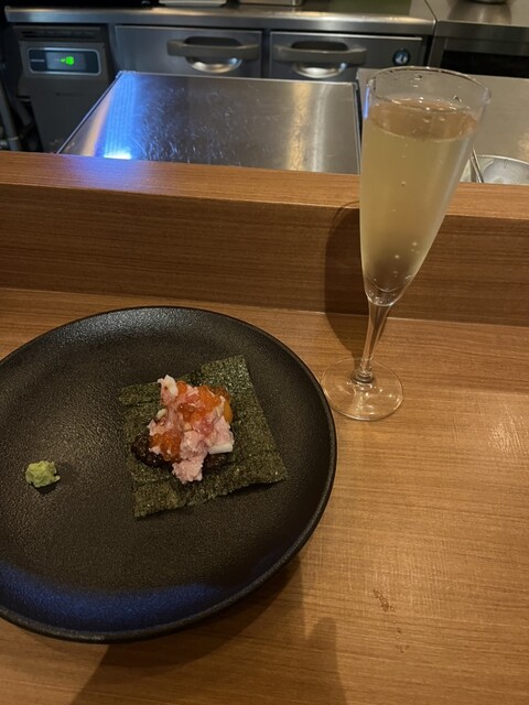 トロ、イクラ、半熟の卵黄、シャキシャキの玉ねぎが海苔を敷いて出てきます。