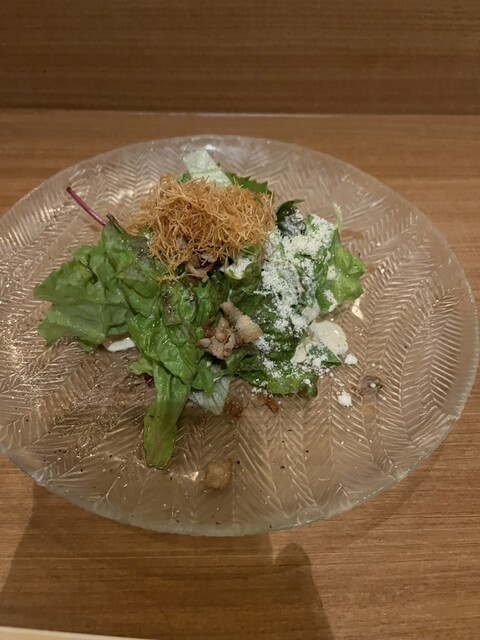 料理はコースとのこと、最初にサラダが出てきました。