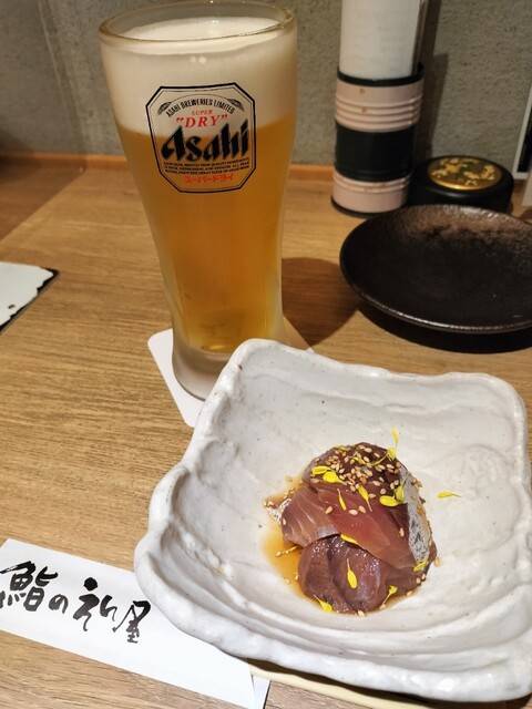 刺し身盛りとつぶチャンジャ、ビールをまず注文、ほどなくビールとお通しのぶりの漬けが来ました。