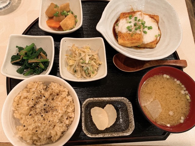 晴れた土曜日の14時頃訪問。 先客は6組でまだ賑わっている。 20代〜50代、1人の方も多い。 豆腐ステーキ トマトソースのランチセット 1,000円(税抜) 惣菜3品... 続きを読む»