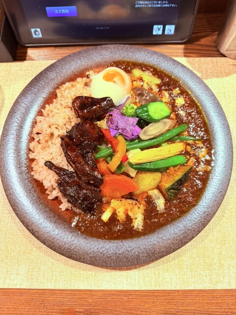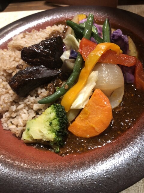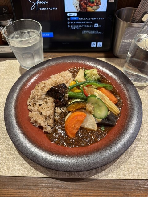 フレンチカレーSPOONでは、健康をテーマに 素材を生かした料理をお出ししています。 定番のフレンチカレーは粉やバターを、 極力使用しておりません。 2日間かけて仕上げるフォンドヴォーをベースに 6時間煮込み、3日間熟成させることで ヘルシーかつ、コクのあるカレーに仕上げています。 ごはんは、健康面も配慮し、ルーとのバランスも考え 少し固めに炊いた13穀米を使用しております。 |