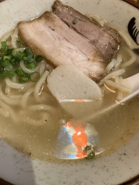 ソーキそばのトッピングは、ソーキ3ピース、魚肉の練り物、分葱など。ソーキはとろっとろ、スープはあっさり、極太麺は歯応えよく、安定のおいしさです。