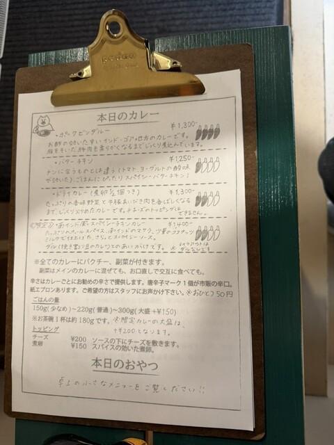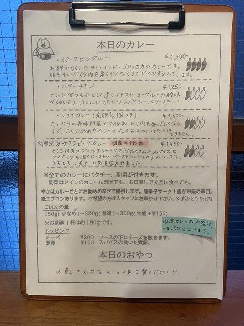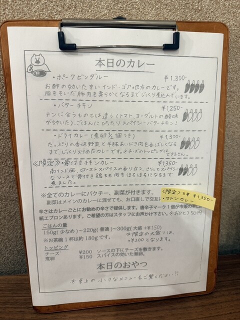 レギュラーメニューは「ポークビンダルー(1,300円)」「バターチキン(1,250円)」