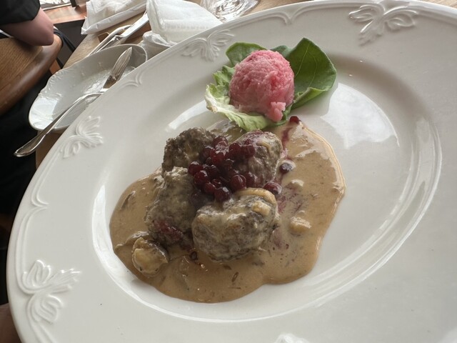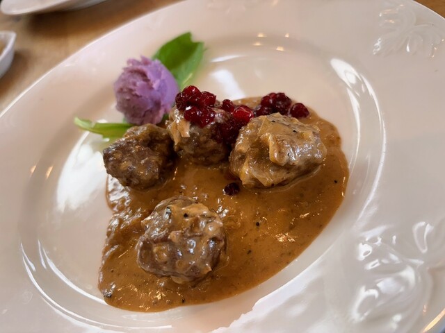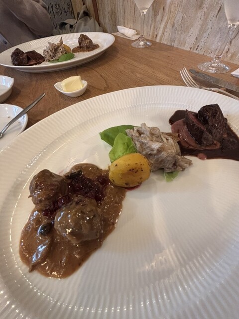 前菜もメインのお肉料理もデザートもすべて盛り合わせで、一口ずつたくさんの種類をいただきました。鹿肉やミートボールにもベ...