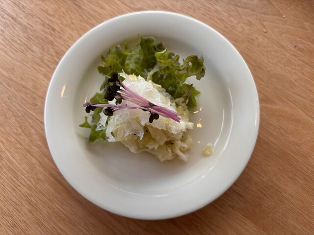 ・キャベツのサラダ(自家製アンチョビドレッシング、スウェーデン産リンゴンベリー、ポテサラはビーツのピンク色)
