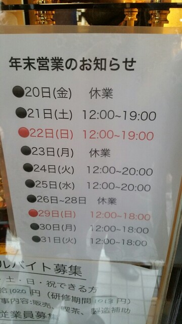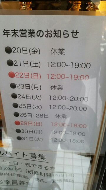 営業時間 2016/11現在、オープンは大体12時~(マカロンや焼き菓子のみ)、ケーキの販売は14時〜、カフェのオープンは14時頃でお店に確認がおすすめ 日曜営業 定休日 月曜、火曜、水曜、木曜 営業時間・定休日は変更となる場合がございますので、ご来店前に店舗にご確認ください。 |