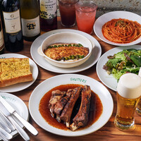 看板メニューの100%国産の豚肉を使用したスペアリブを始め濃厚なトマトの酸味を感じられるトマトソーススパゲッティなどSHUTTERSでしか味わえない1品が勢揃いとなるコースになります。また生ビールを含む全30種類の飲み放題付きとなります。 仕事帰りや宴会などでご利用ください。