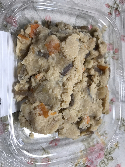 ベースはおからなのでね。多少のポソポソ感は見え隠れするけど、思ってるよりも食べやすいという印象です。味付けはしっかり施されている。ゴボウやニンジン、こんにゃく。あと、肉みたいなのも入ってた?