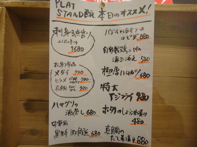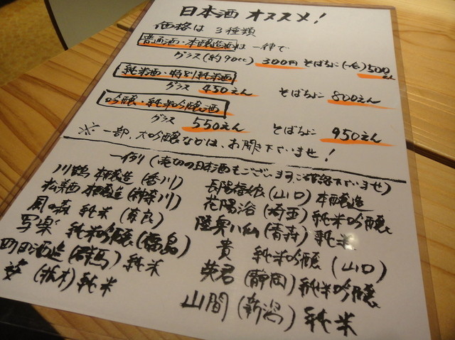 卓上のメニュー表以外、壁の黒板に手書きで、銘酒や料理の品々が書かれている。