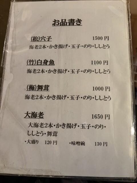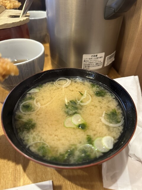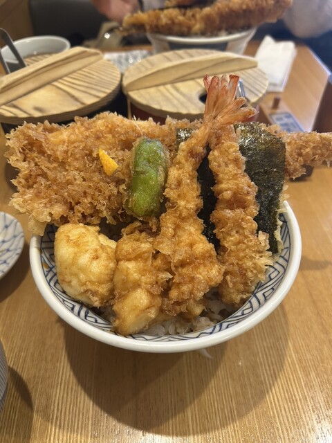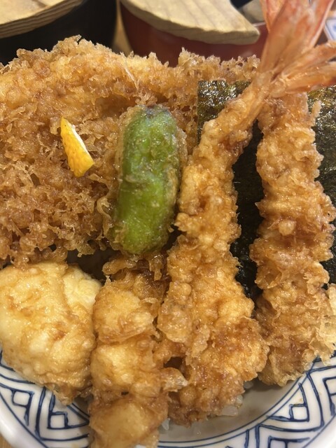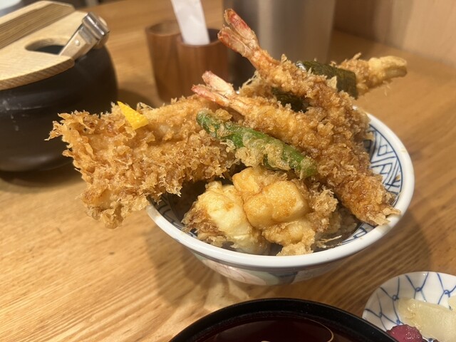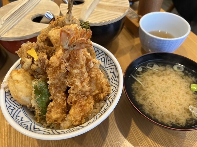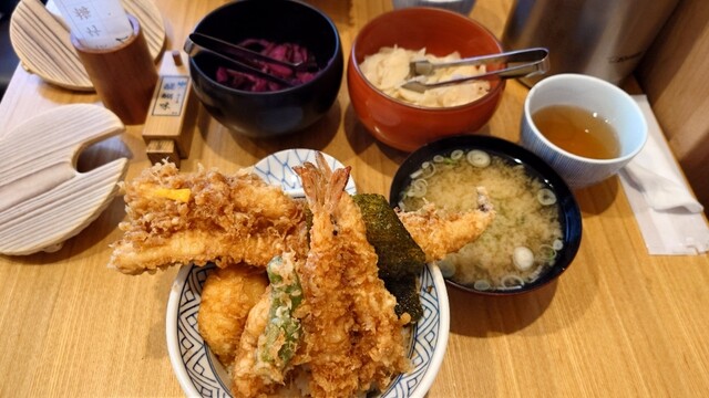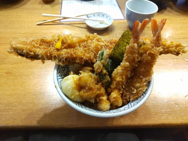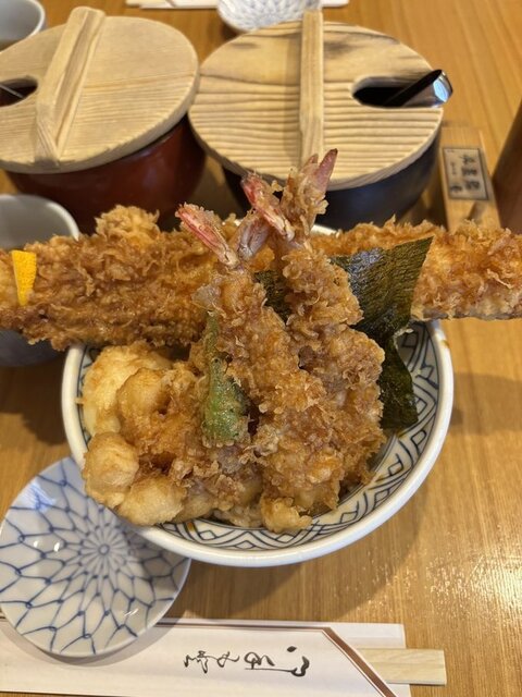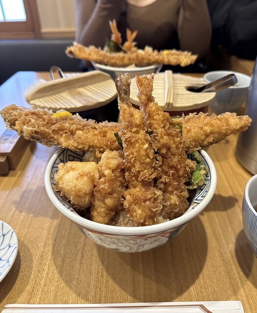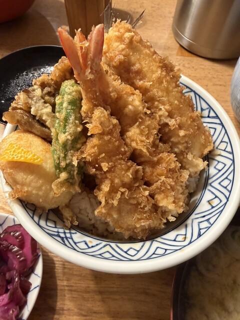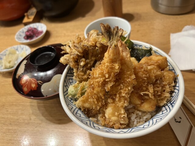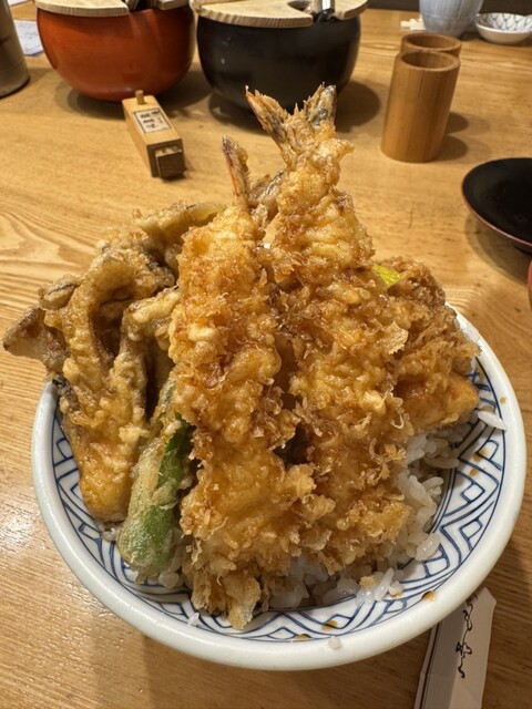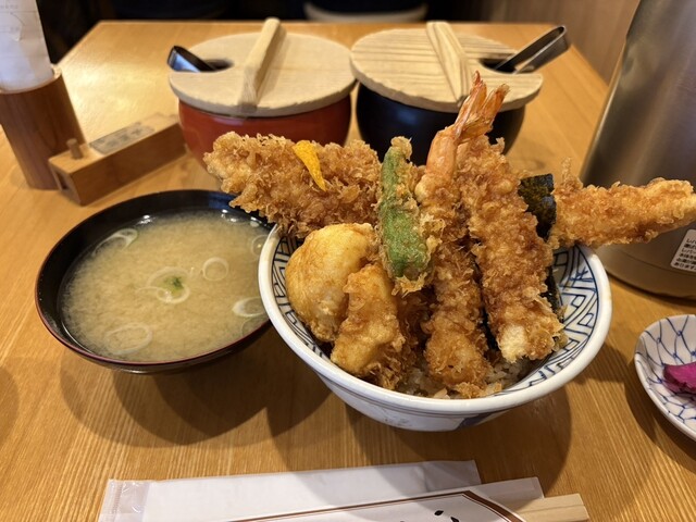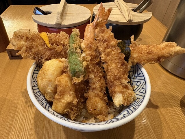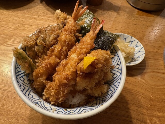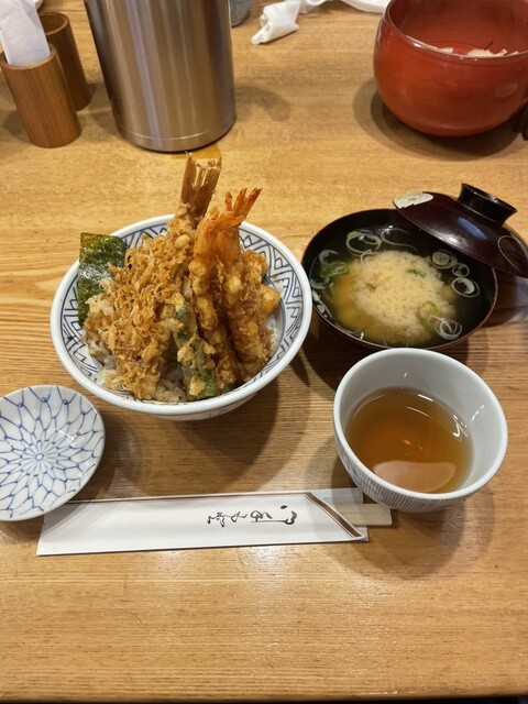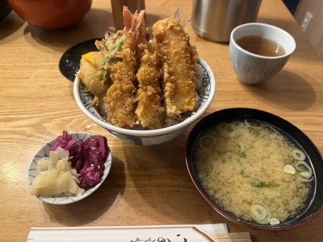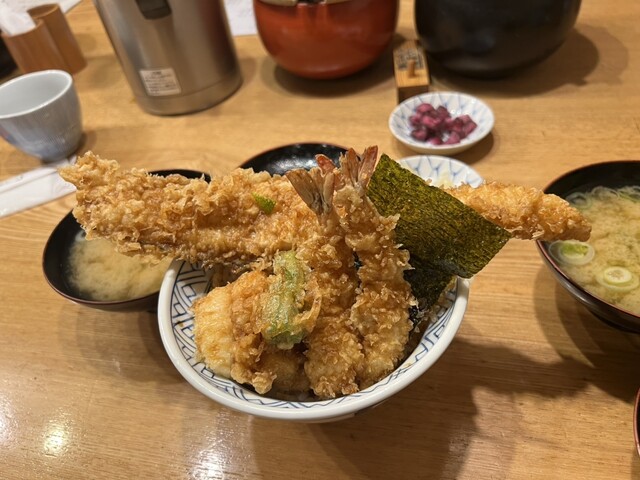 奥さんと二人で天丼(松)を注文。1500円でした。大きな穴子、エビ二匹、イカなどボリュームも十分。とにかくカラッと揚げられていて、天ぷら油のしつこさが全くなく、大変美味しくいただきました!漬物も取り放...