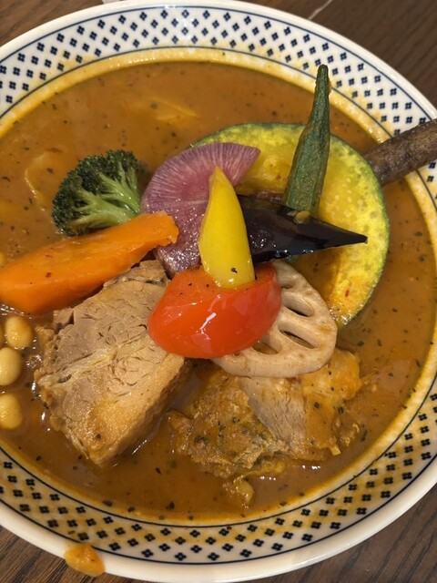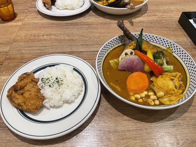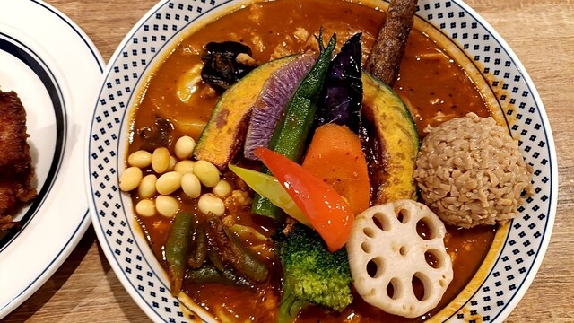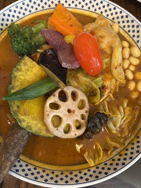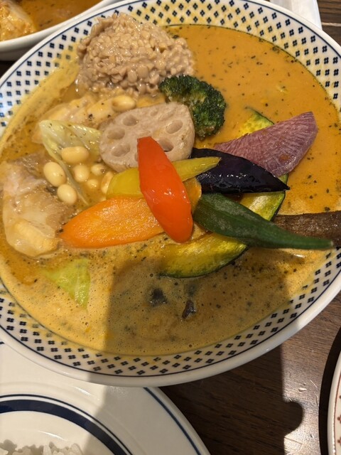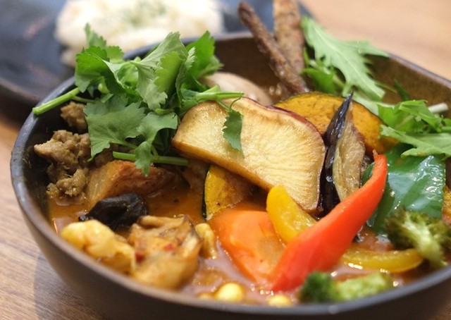 色とりどりに盛り付けられたお野菜たちで、見た目にも楽しいスープカレーです!