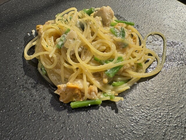 吉祥寺駅のヨドバシ裏にあるお店に行きました。店内は落ち着いた雰囲気で、ソファー席が一列に並んでおり、カウンター席からは店員さんが料理をしている様子が見えます。照明も明るすぎず、ゆったりと過ごせる空間でした。 こちらのお店の興味をそそられる点は、パスタが細麺になっているんですよ。ソースは一から自... 詳細を見る
