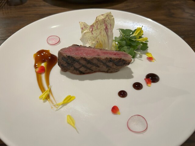 ・A5雪降り尾花沢牛 イチボのグリエ 卵黄すき焼きソースと照り焼きバルサミコ