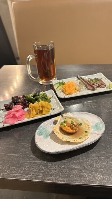 注文したのは、漬物盛り合わせ、カツオのたたき、ホタテのバター焼き、いくらの握り、ししゃも。